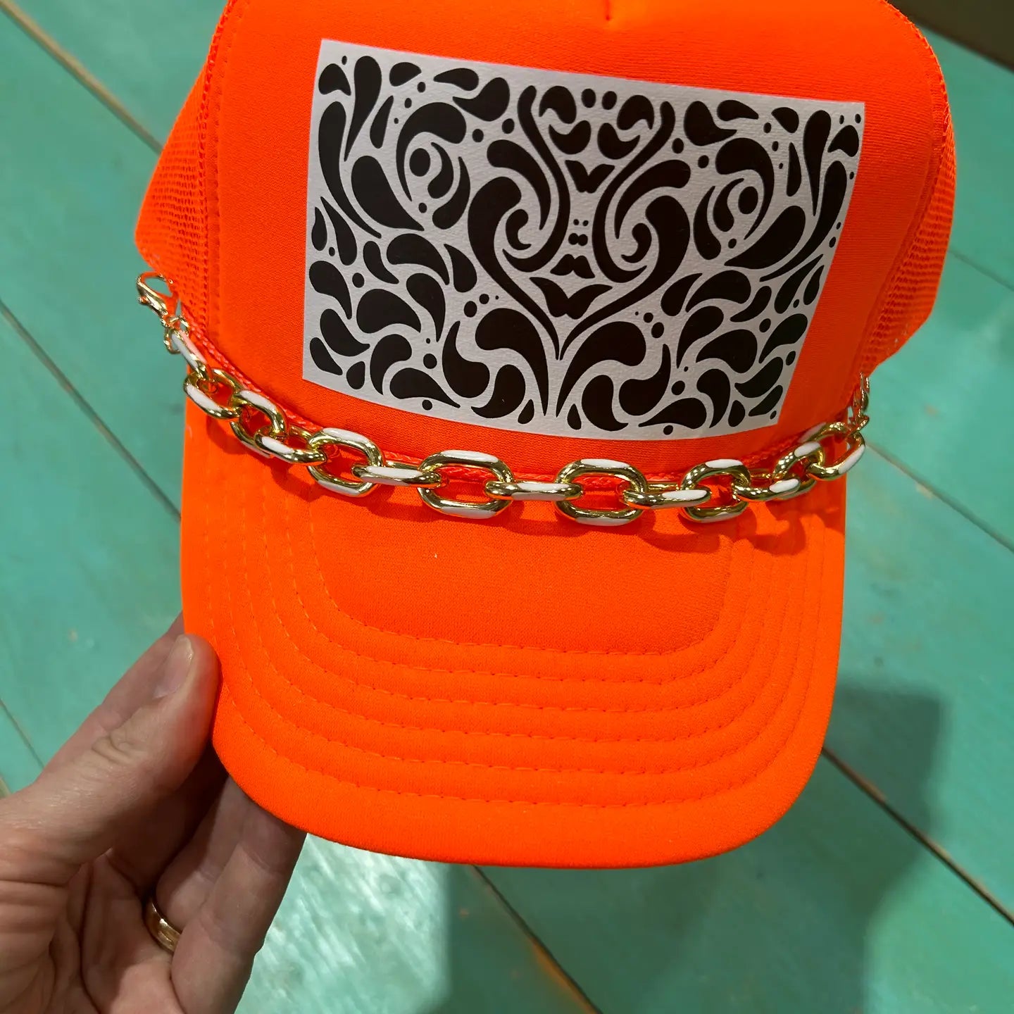 This trucker chain is one of our new & limited edition trucker hat chains. This chain is a chunky gold chain enamel dipped with white. All our trucker hat chains have lobster claw clasp on either end so they can be easily moved from cap to cap.