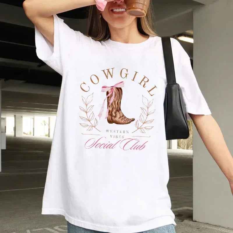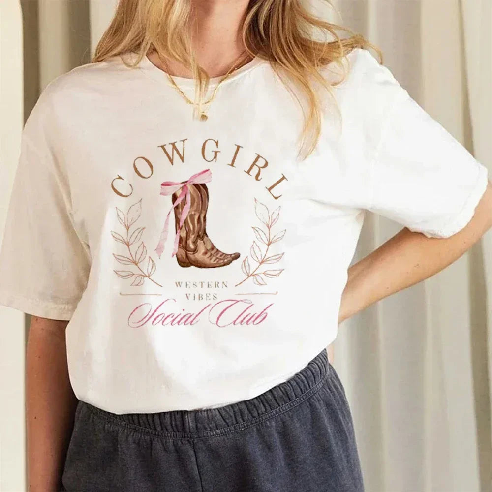 Coquette Cowgirl Boots Trendy Printed T-Shirt Short Sleeved Short Sleeved Printed Basic Top Clothing O-Neck Summer New T-Shirt.