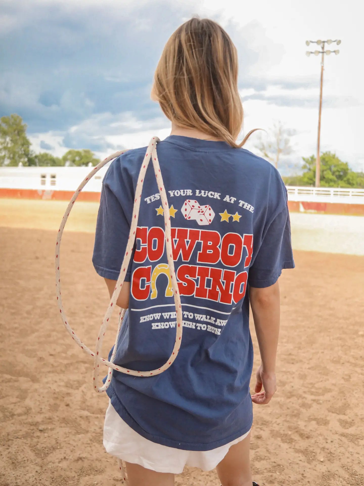 Test your luck at the Cowboy Casino! This blue Comfort Colors tee features a red and gold western casino inspired front and back graphic!