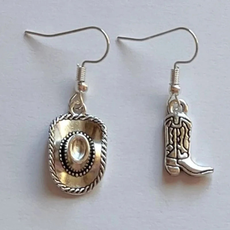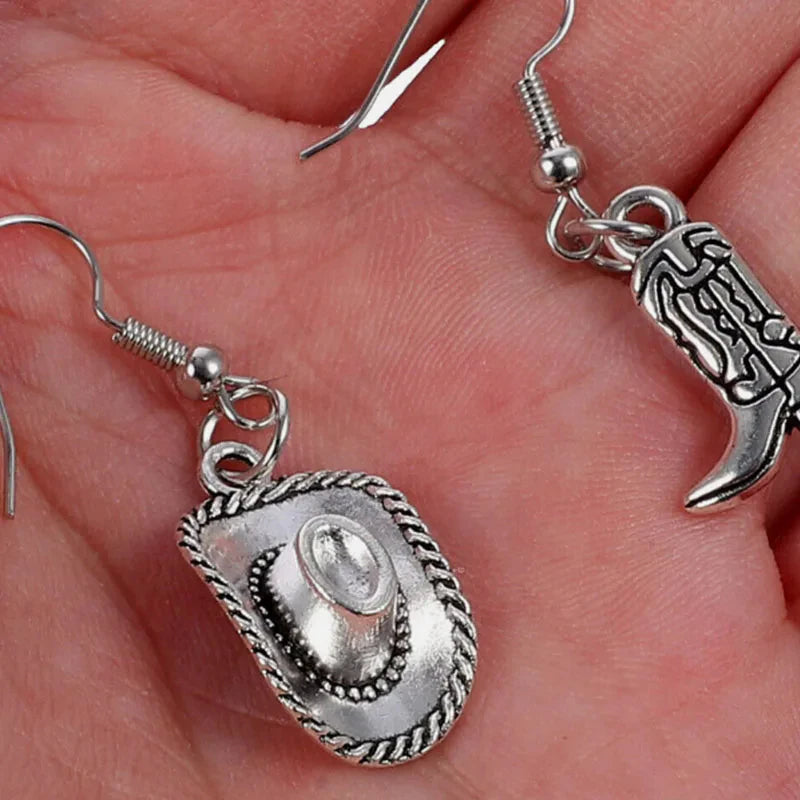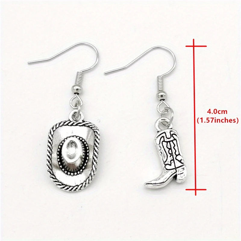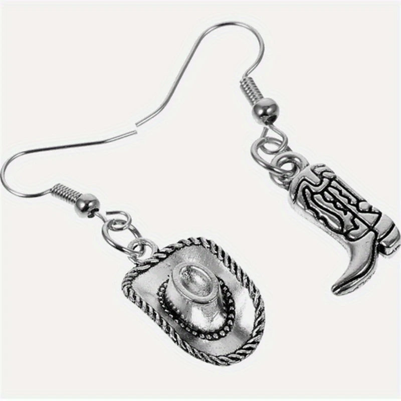 Vintage Style Silvery Cowboy Hat Earrings Cowgirl Boot Pendant Dangle Earrings for Women