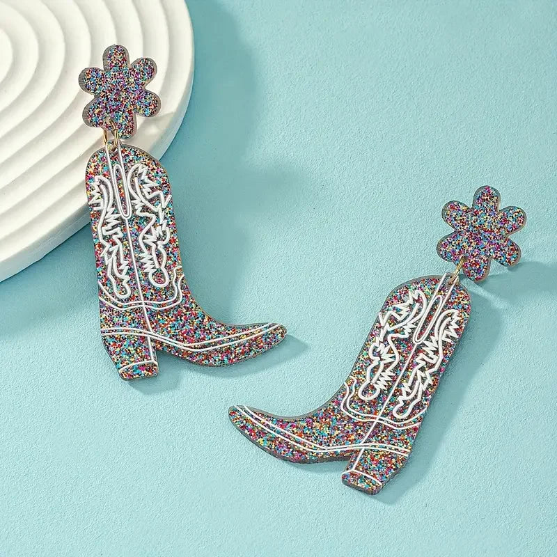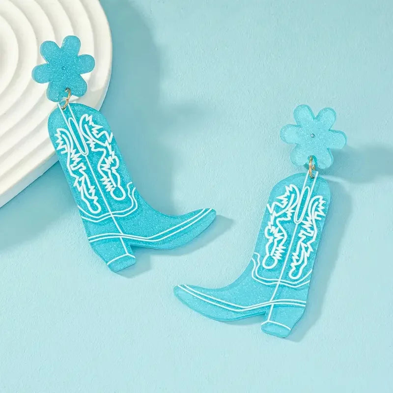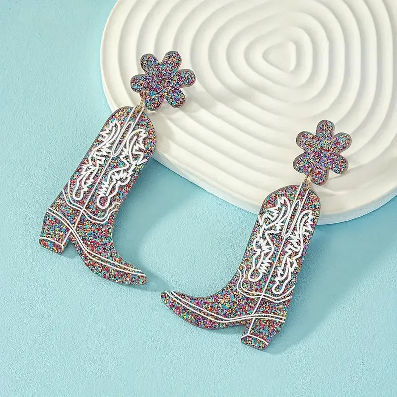 Flower & Western Cowgirl Boots Design Dangle Earrings Cowboy