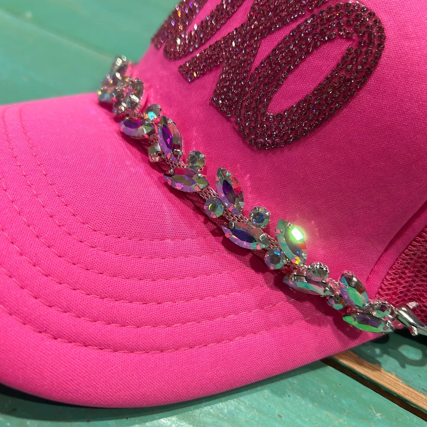 This jumbo AB rhinestone trucker chain is one of our favorites! Add the perfect over the top touch to all your favorite trucker hats with this silver & AB rhinestone trucker hat chain. All our trucker hat chains come with lobster claw clasp on either end so they can easily be moved from hat to hat.