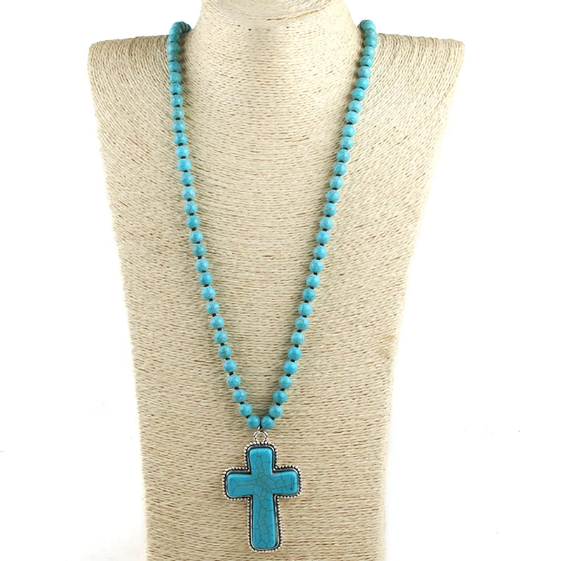 Bohemian western Jewelry 8mm Stone Knotted Cross Pendant Necklace For Women