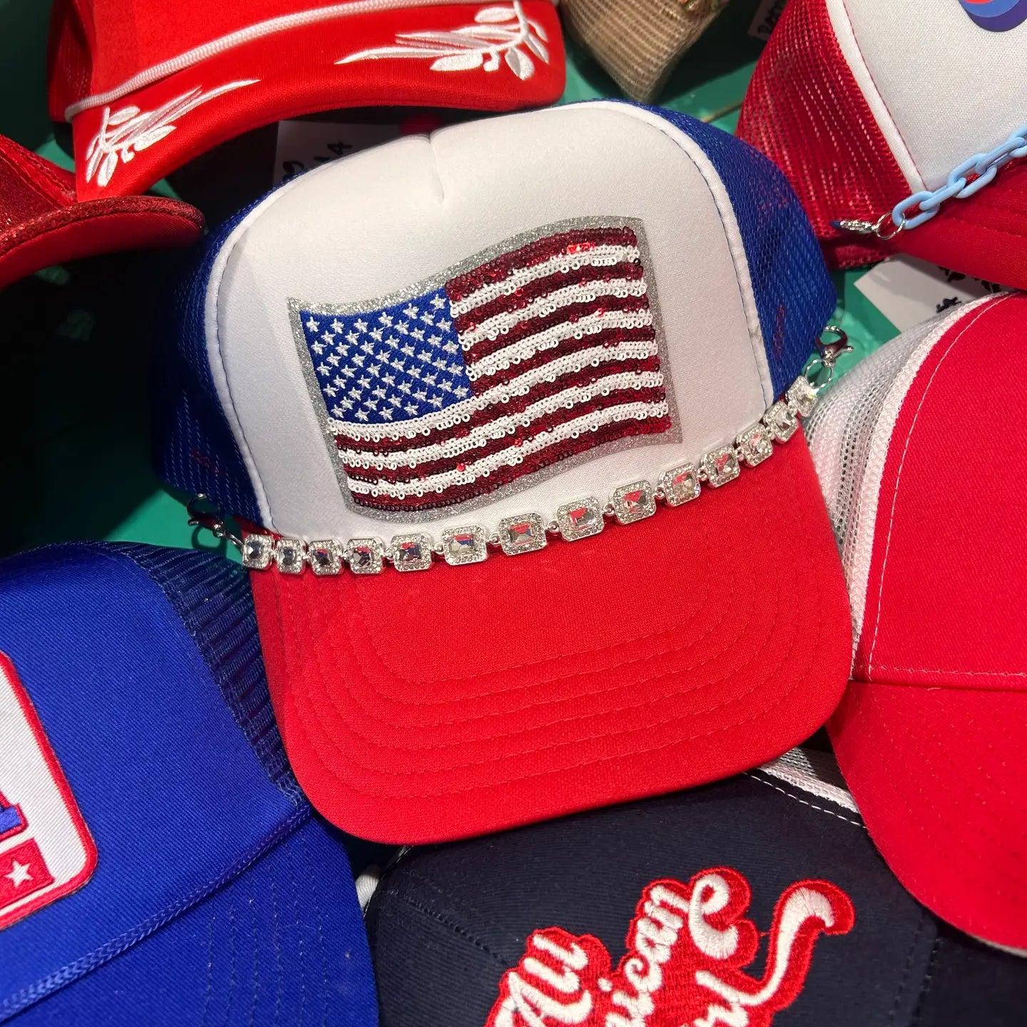 Our sequin American Flag trucker hat is red, white, & fabulous! Available on your favorite color foam trucker hat! Foam truckers have a foam front, mesh back, and adjustable snapback enclosure. Don't forget to pair with one of our trucker hat chains for the perfectly patriotic trucker hat!