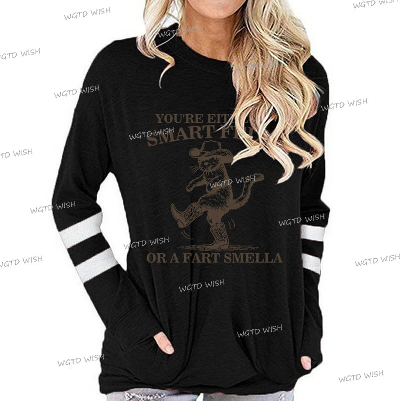 Vintage Western Cowboy Cat T-shirt Women "You're Either A Smart Fella or A Fart Smella" Print T Shirts Long Sleeve Ladies Tshirt