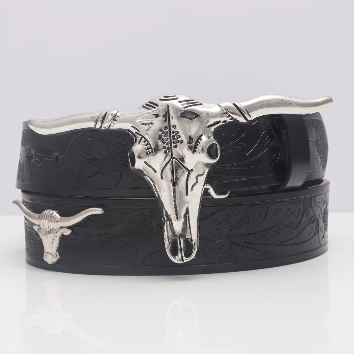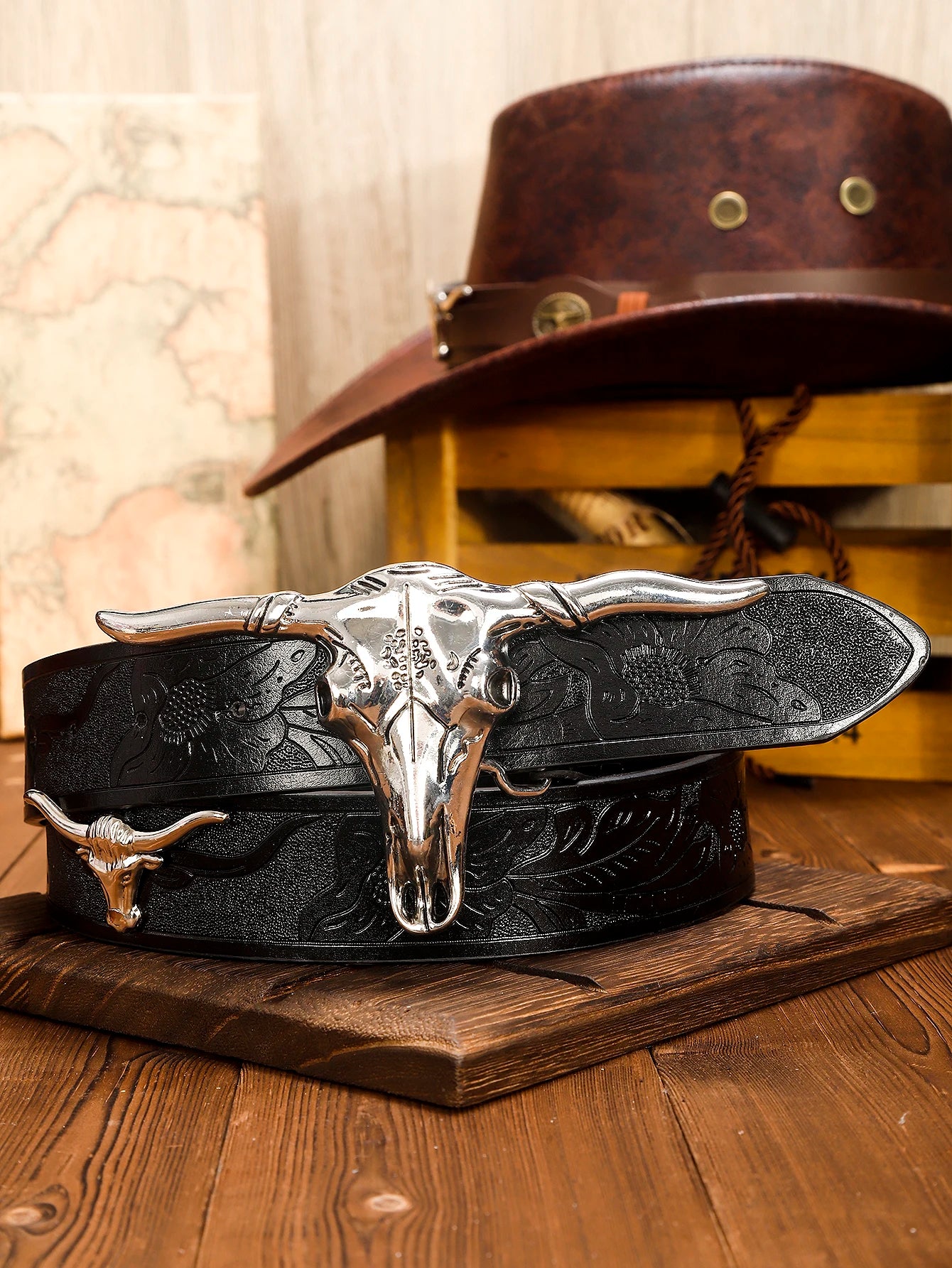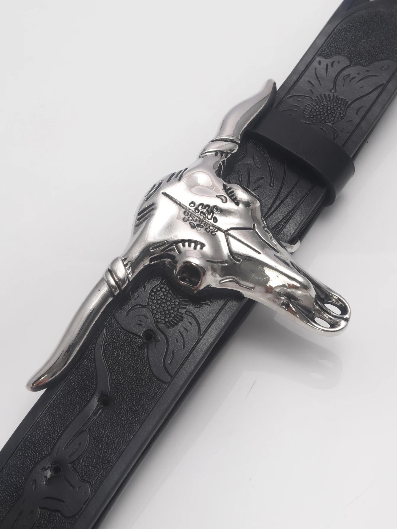 Western Cowboy Pu Leather Belt Black Belt with Long Horn Bull Western Belt Buckle