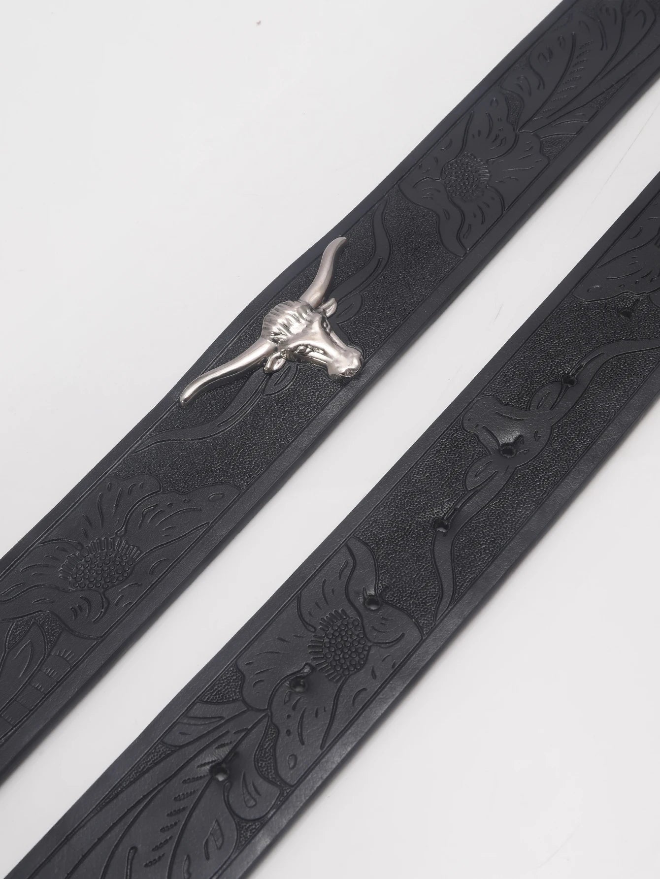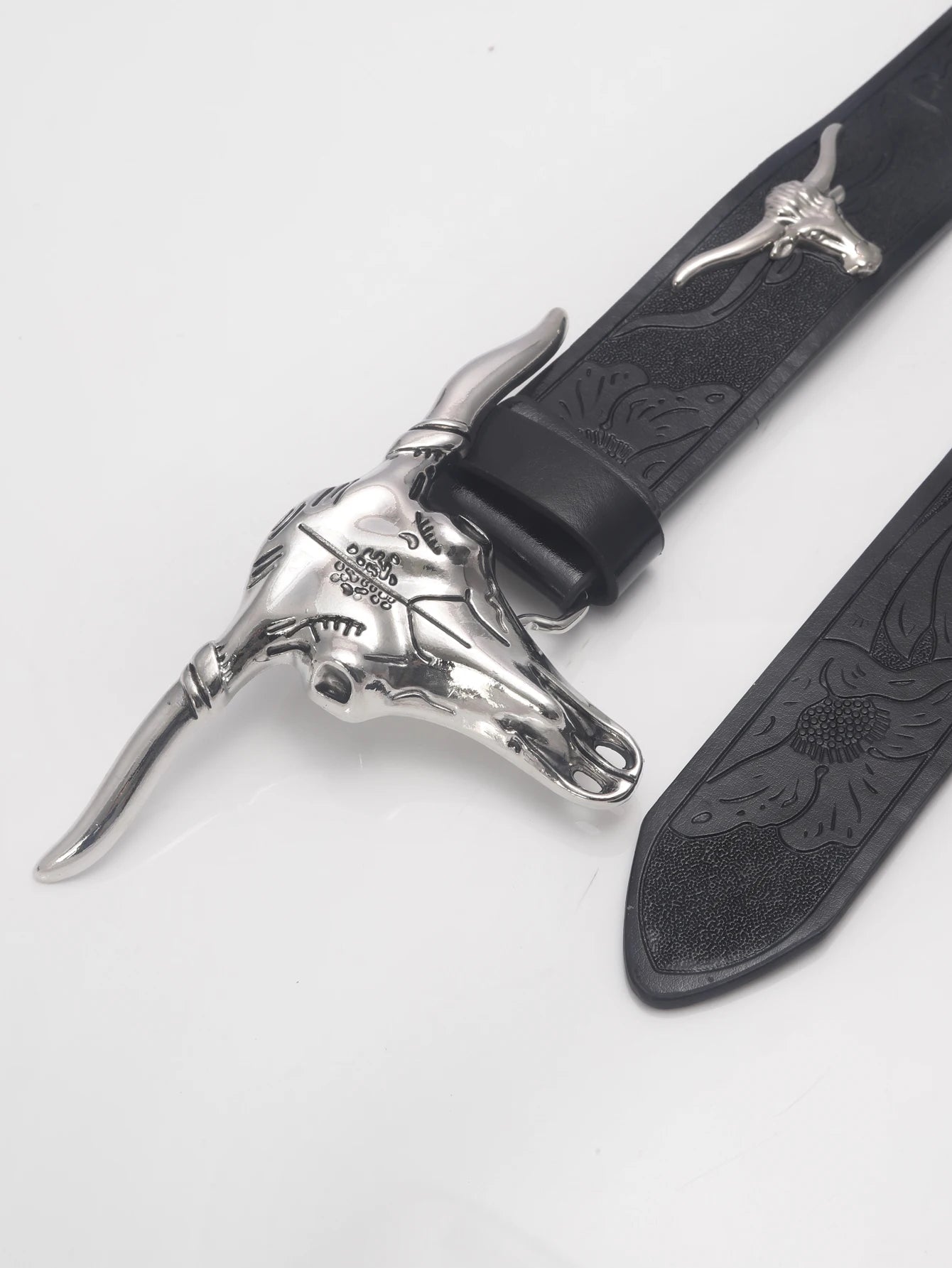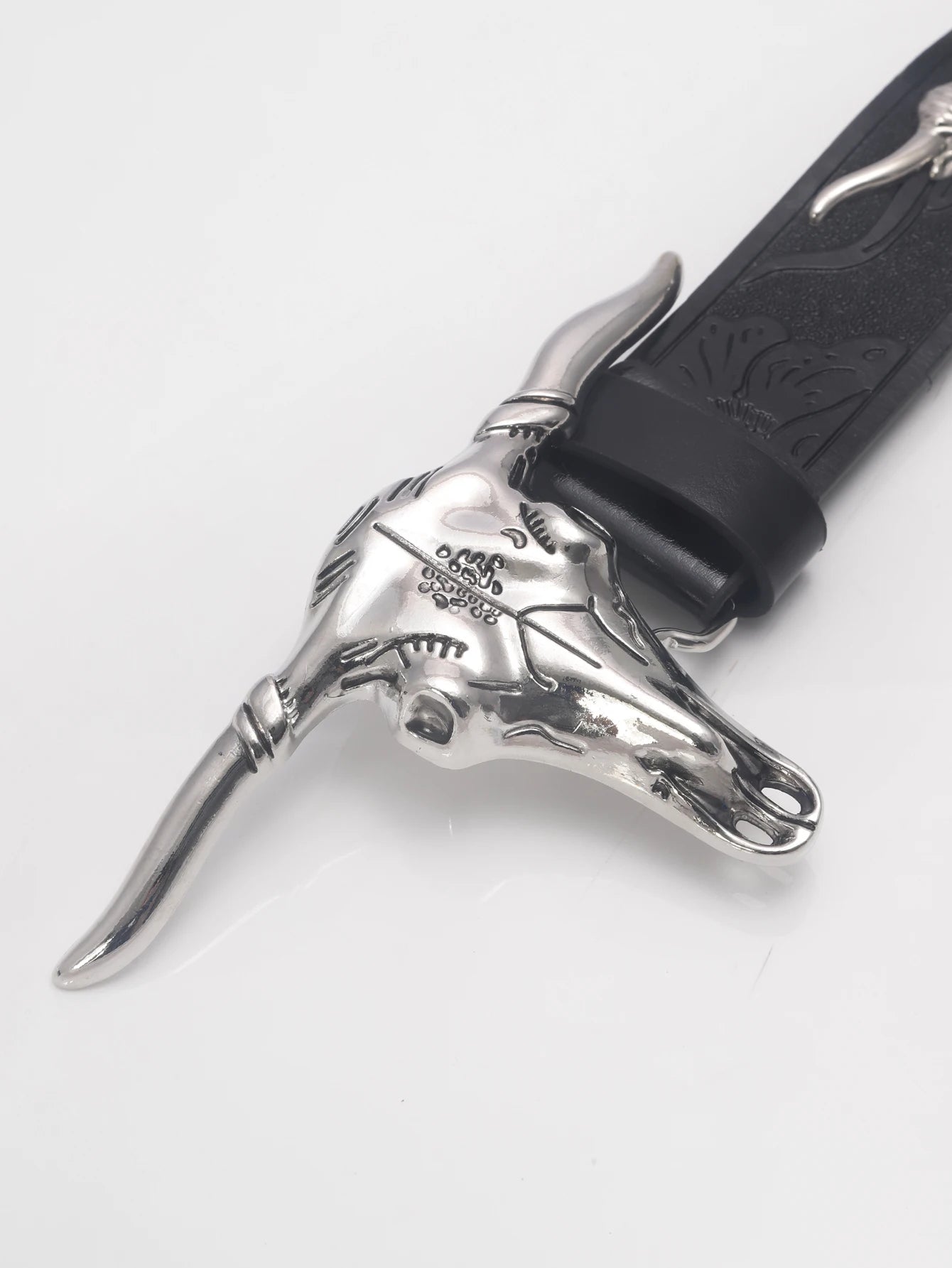 Western Cowboy Pu Leather Belt Black Belt with Long Horn Bull Western Belt Buckle